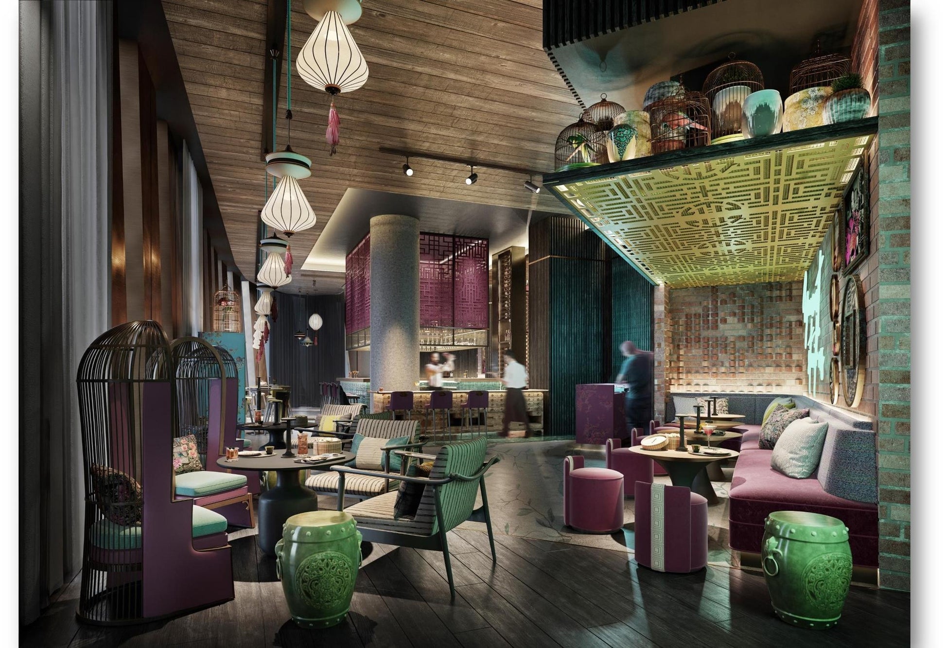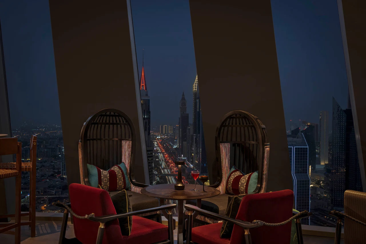 Plush red seating, glowing script, eclectic artwork, and warm brick walls create an atmosphere that feels intimate yet electric, while floor-to-ceiling windows frame the skyline beyond.